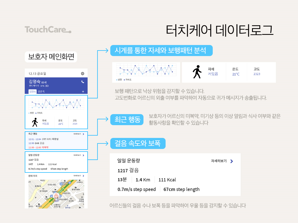 집안에 센서를 부착하는 경우는 환경센서들 위주라서 사고감지만을 중점으로 합니다. 그 외에 AI스피커나 돌봄인형을 사용해서 정서적 케어를 하는 경우에도 기계 사용에 어려움이 있으신 어르신들이 많으시기 때문에 효과성이 미비합니다. 반면 터치케어는 사고 감지뿐만 아니라 사고예방, 더 나아가 AI 순이를 통한 교감, 행동촉진까지 이끌어내고, 이 모든 것을 한 가지 제품으로 가능하도록 토탈서비스를 제공합니다.