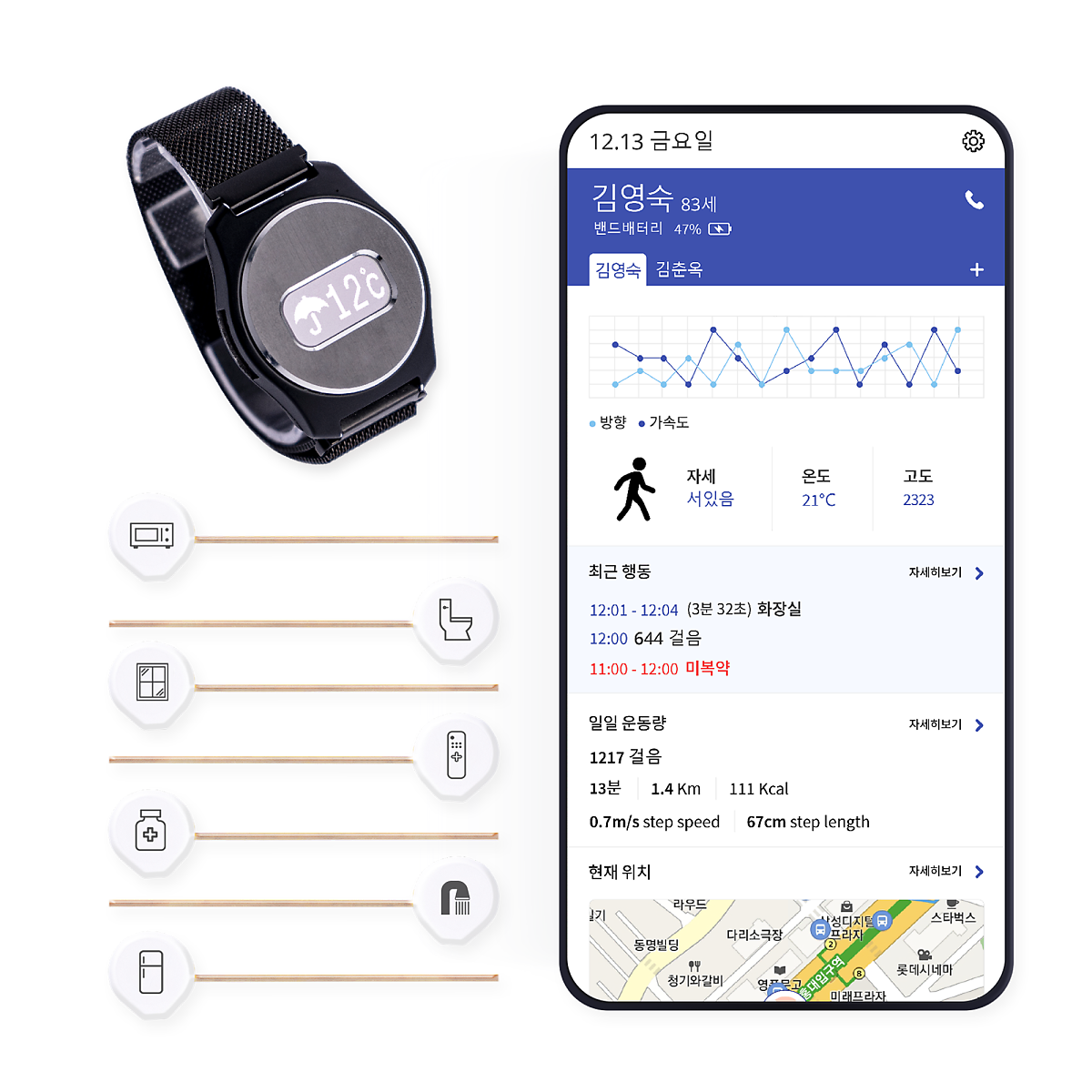 터치케어는 기본적으로 사물의 접촉기반으로 데이터를 수집해요. 냉장고 손잡이 등 어르신들의 손이 닿는 곳에 사물부착태그를 설치하면, 일상행동 데이터를 촘촘히 수집할 수 있어서 보호자가 원격에서 실시간으로 돌봄이 가능합니다.